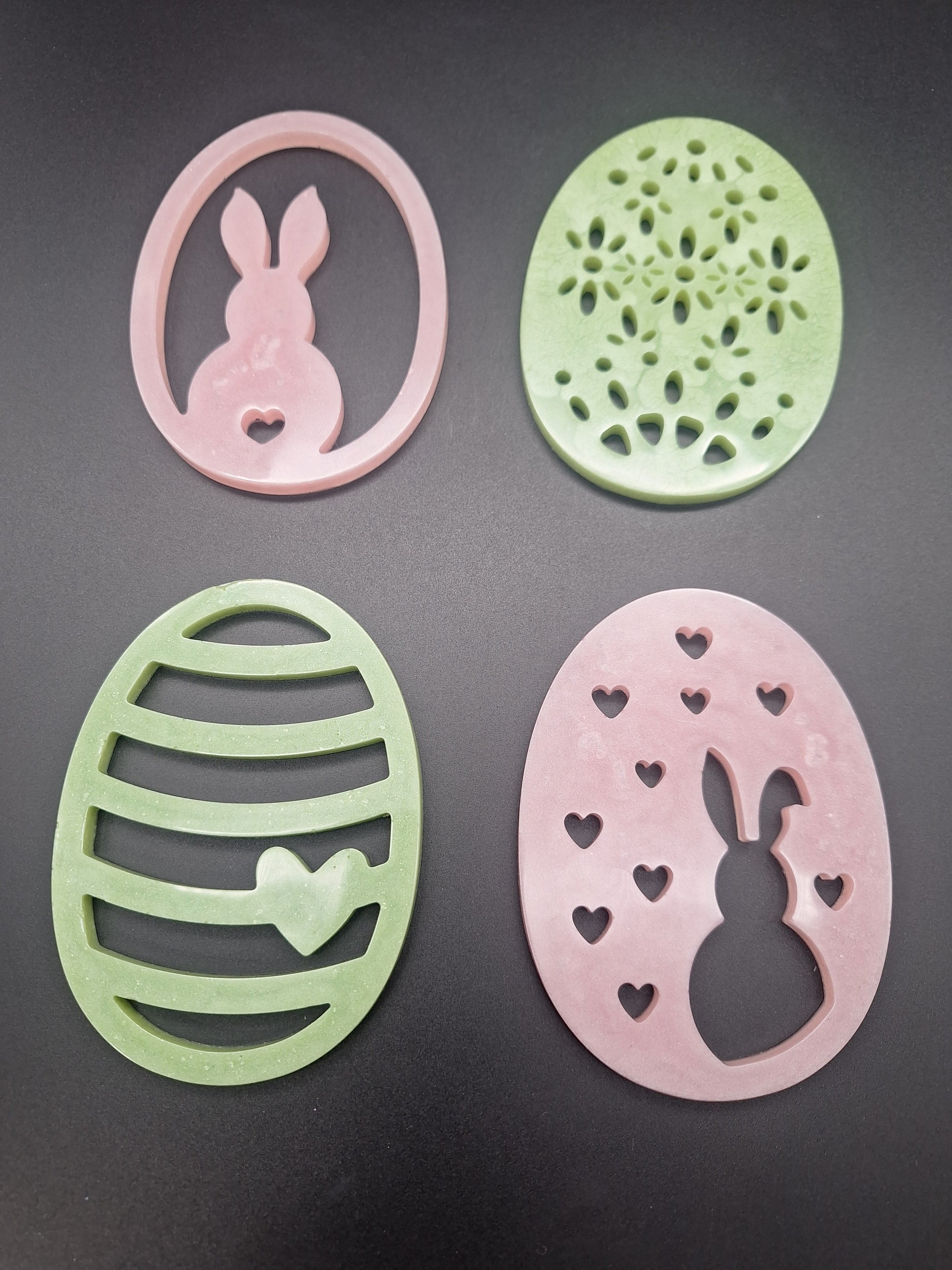 Die Osteranhänger sind in verschiedenen Formen erhältlich, zum Beispiel als Ei mit filigranen Ausschnitten oder mit Hasenmotiv. Auch bei den Farben gibt es eine schöne Auswahl, von hellem und dunklem Grün über Grau bis hin zu zartem Rosa. Jeder Anhänger ist ein kleines Unikat und bringt eine stilvolle Osterstimmung in dein Zuhause.