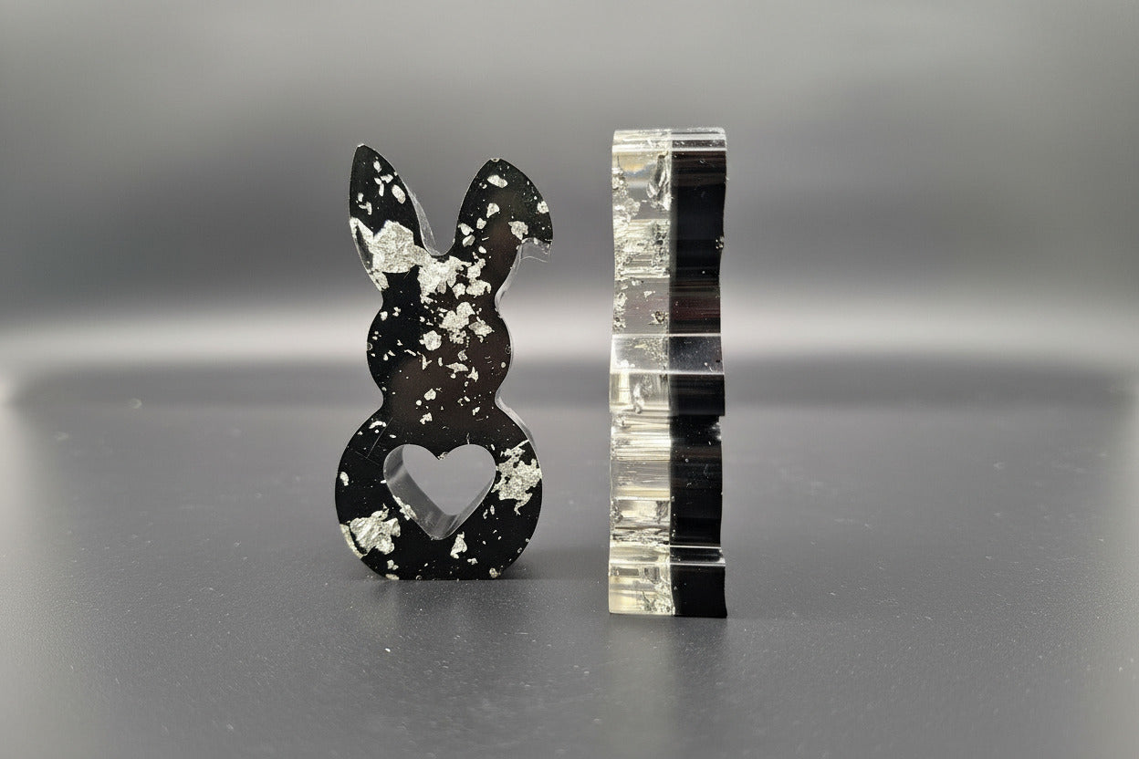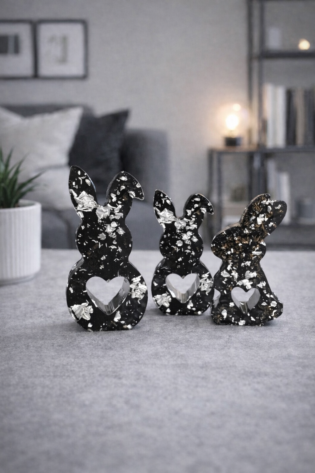 Diese drei stilvollen Hasenfiguren aus hochwertigem Epoxidharz sind wahre Blickfänger für dein Zuhause. Mit ihrer halbtransparenten Optik, edlen Schwarznuancen und silbrigen Akzenten verleihen sie jeder Einrichtung einen Hauch von Eleganz – nicht nur zu Ostern, sondern das ganze Jahr über.