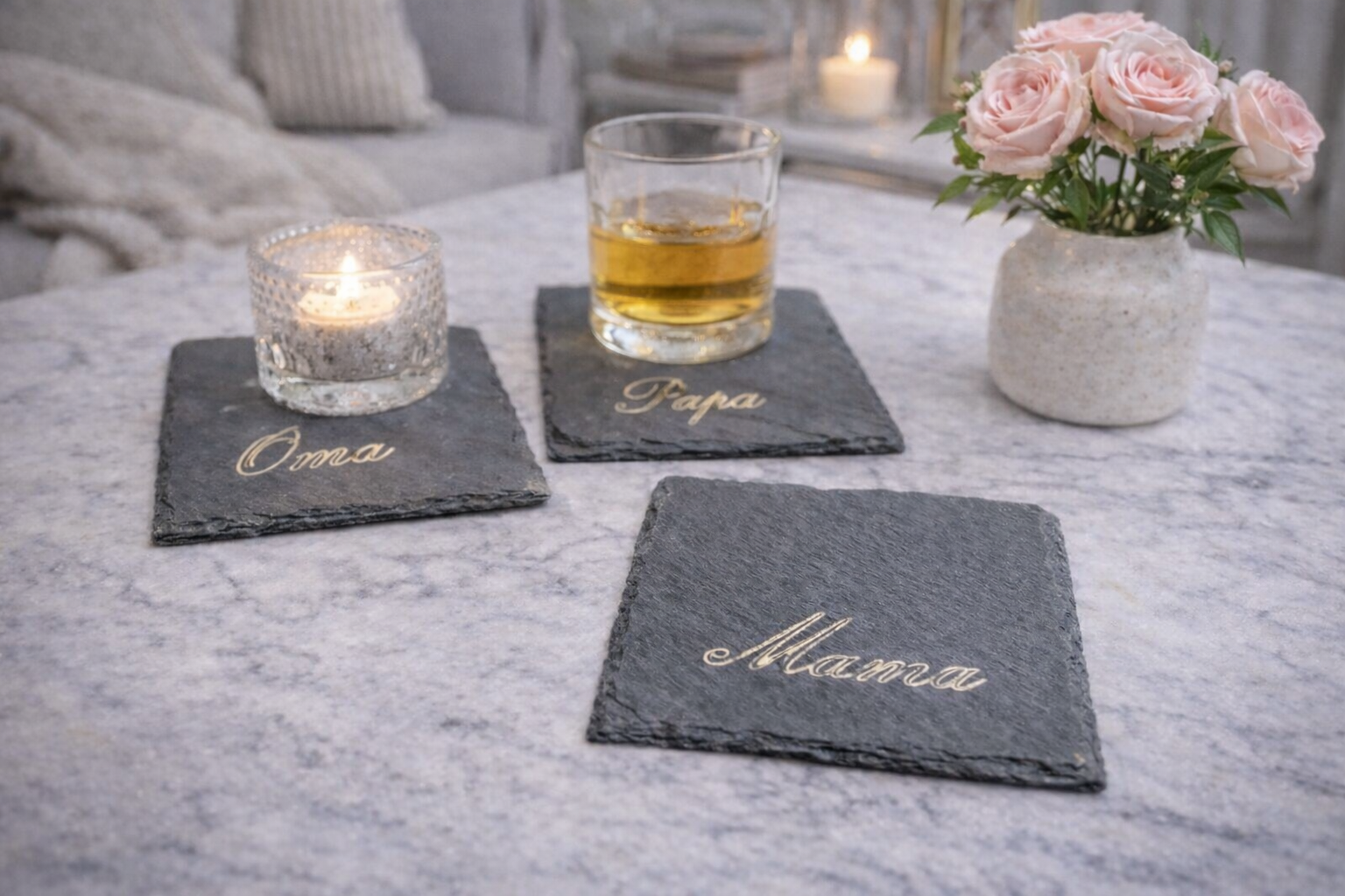Die Untersetzer sind in verschiedenen, bereits gravierten Designs erhältlich. Auf Wunsch können sie auch individuell personalisiert werden. Ob Name, Schriftzug, Symbol oder ein persönliches Motiv. So entsteht ein ganz besonderes Einzelstück, das genau zu dir oder dem Beschenkten passt.